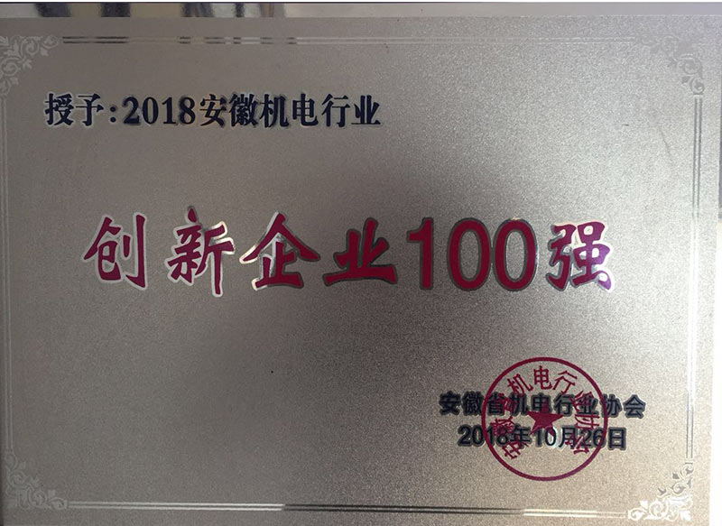 安徽機電行業創新企業100強證書